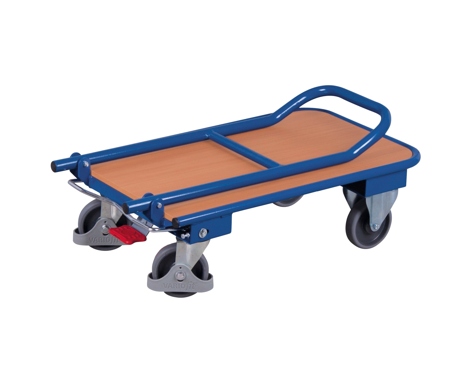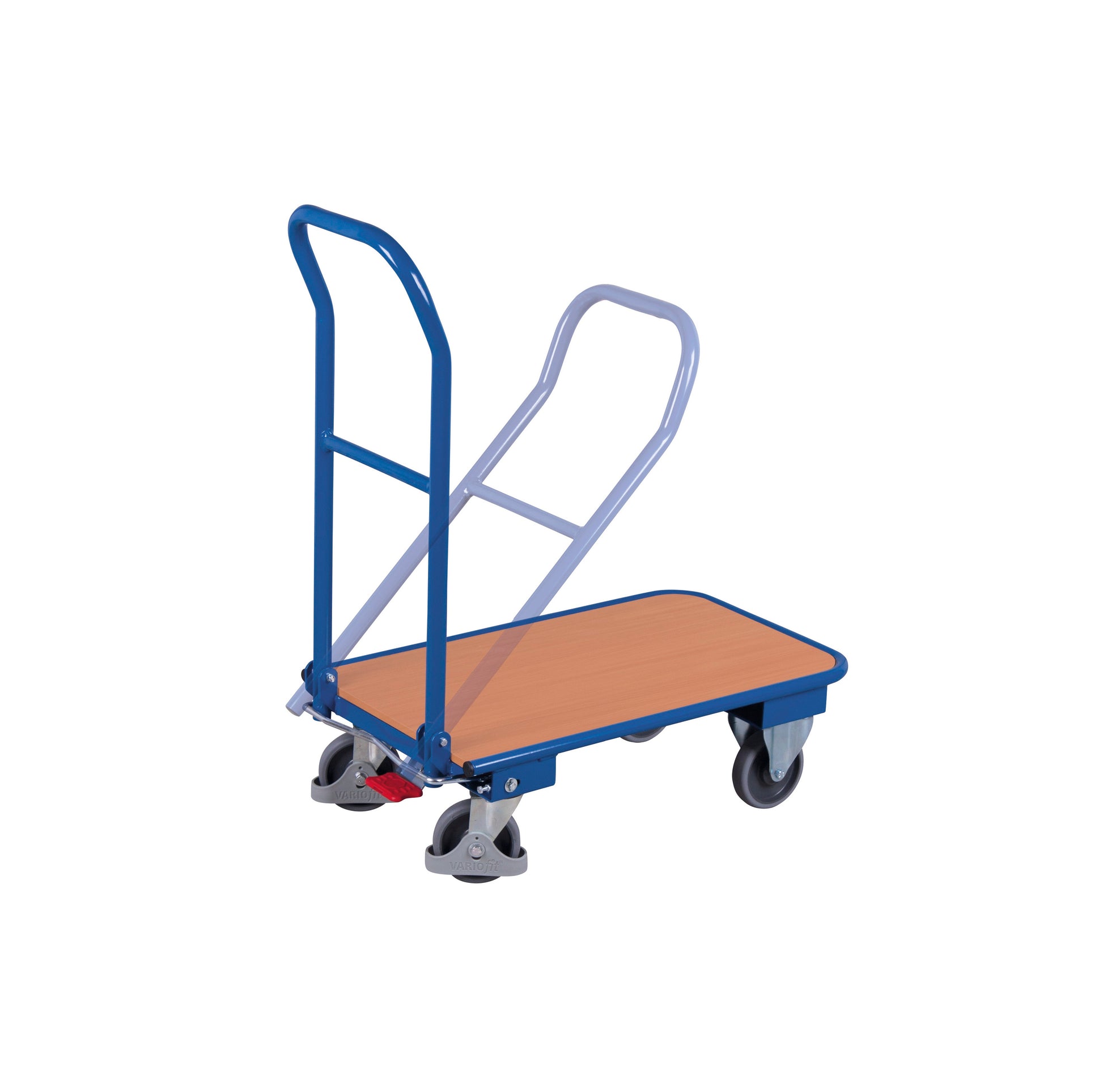 Stabile Schweißkonstruktion aus Stahl; klappbarer Schiebebügel mit Querstrebe; Ladefläche aus Holzwerkstoffplatte; Oberfläche Buchendekor; Wagen pulverbeschichtet RAL 5010 enzianblau; dauerhaft oberflächengeschützt; schlag- und kratzfest; Bereifung aus thermoplastischem Gummi auf Kunststofffelge mit Präzisions-Rillenkugellager, grau, "spurlos"; Faden- und Fußschutz; 2 Lenkrollen mit EasySTOP und 2 Bockrollen.